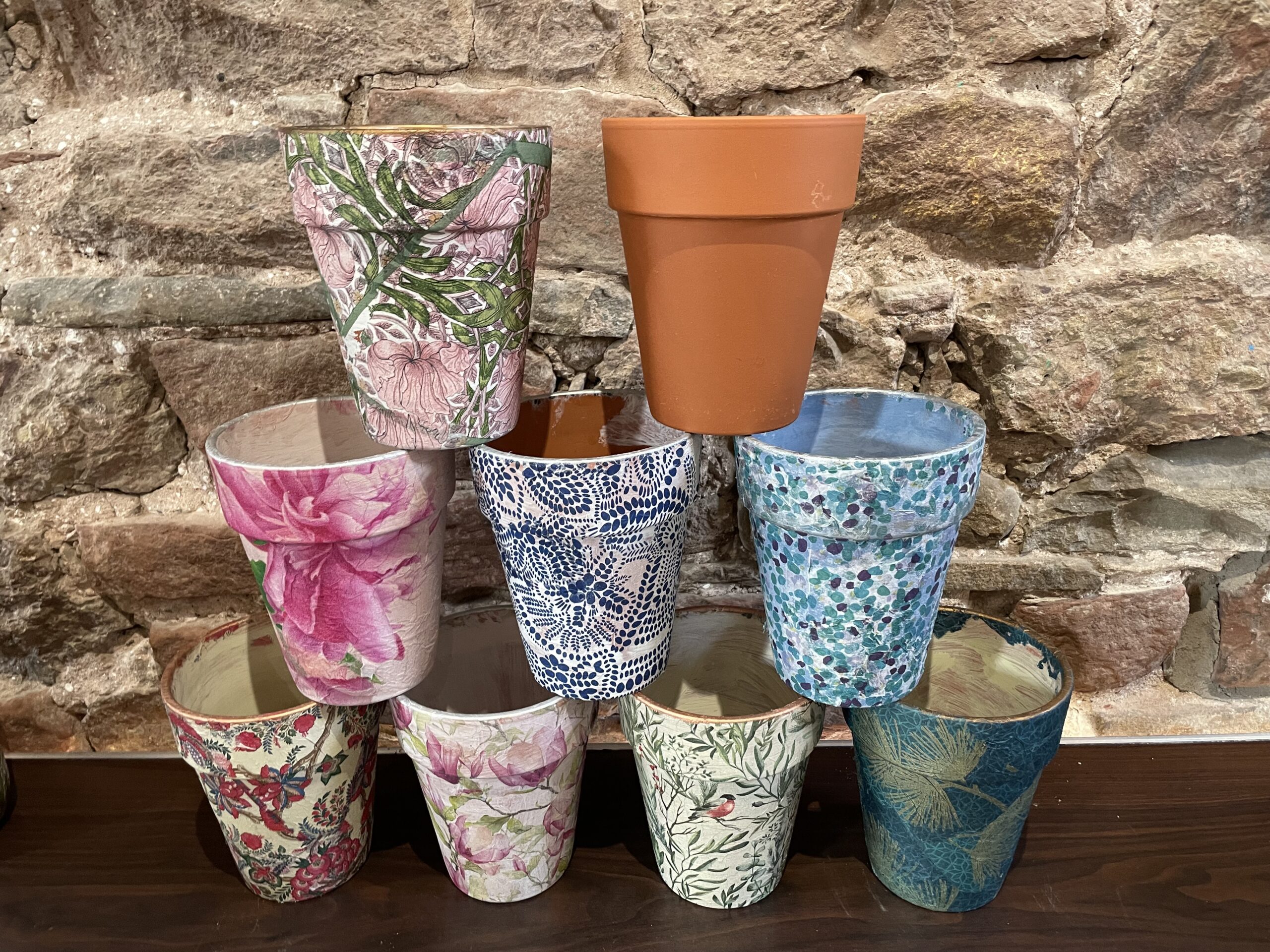 Join our lovely Jules for a morning learning the basics of decoupage – Jules will show examples of her work on a tour of our shop, you will then have a choice of designs to chose from to complete your projects – a plant pot and a jar. She will guide you through all the stages of the process and there will be plenty of time for questions – please bring a box to take your finished pieces home.